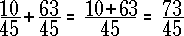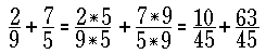 Bei dem ersten Ausdruck steht 9 und bei dem zweiten 5 im Nenner. Die Brüche können erst addiert werden, wenn bei beiden das Gleiche im Nenner steht. Hierzu müssen die Brüche erweitert werden. Der erste Bruch kann mit dem Nenner des zweiten und der zweite Bruch mit dem Nenner des ersten erweitert werden: